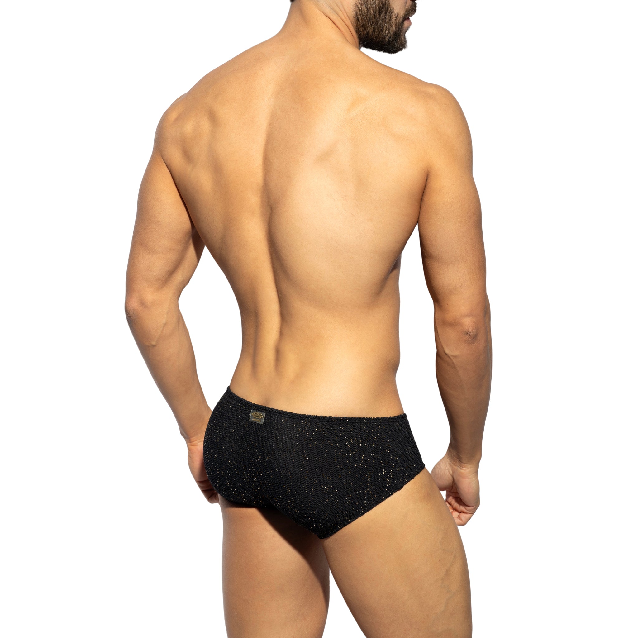 Introducing the ES Collection Gold Glitter Sunga Black—where luxury meets playful elegance. This innovative bikini brief features a shimmering gold mesh fabric, promising to dazzle in all the right ways. With moulded technology, enjoy a seamless, ultra-comfortable fit that hugs your form perfectly. Designed to bring some glamour into your everyday, these undies are irresistibly soft and a must-have for those who love to shine.